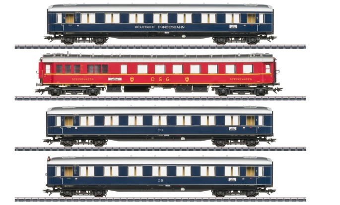 Das exakt passende und hochwertig ausgestattete Wagenset wird ebenfalls für die Clubmitglieder des Insider- bzw. TRIX-Clubs angeboten. Neben einer bereits montierten Innenbeleuchtung besitzt es an einem Wagen zwei digital schaltbare Schlusslaternen. Pufferkondensatoren und stromführende Kupplungen verhindern das Flackern der Beleuchtung. Die Inneneinrichtung ist mehrfarbig gestaltet
