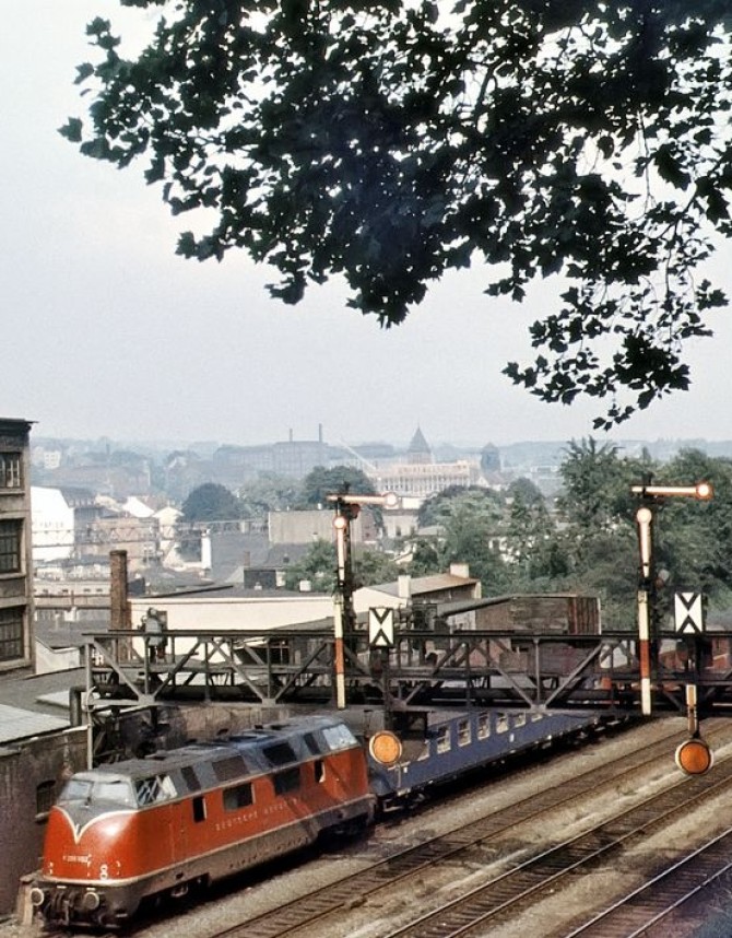 Unsere V200 002 durcheilt 1958 mit dem F34 "Gambrinus" Wuppertal-Unterbarmen.