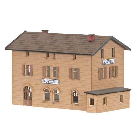 Zwischen Crailsheim und Ellwangen liegt dieser schöne Bahnhof aus geschnittenem Naturstein. Das Modell ist ein Lasercut-Bausatz auch Architektur-Karton. Da diese Art von Bahnhofsgebäuden in identischer Bauform mehrfach errichtet wurden, liegen dem Bausatz unterschiedliche Beschriftungsätze bei.