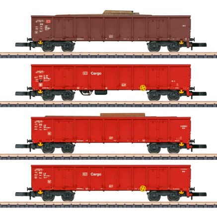 Die Wagen des Typs Eanos sind heute neben den etwas kürzeren des Typs Eaos die am weitesten verbreiteten offenen Wagen in Europa. Dieses Set enthält 4 unterschiedliche dekorierte Wagen der DB AG mit Schrottbeladung.
